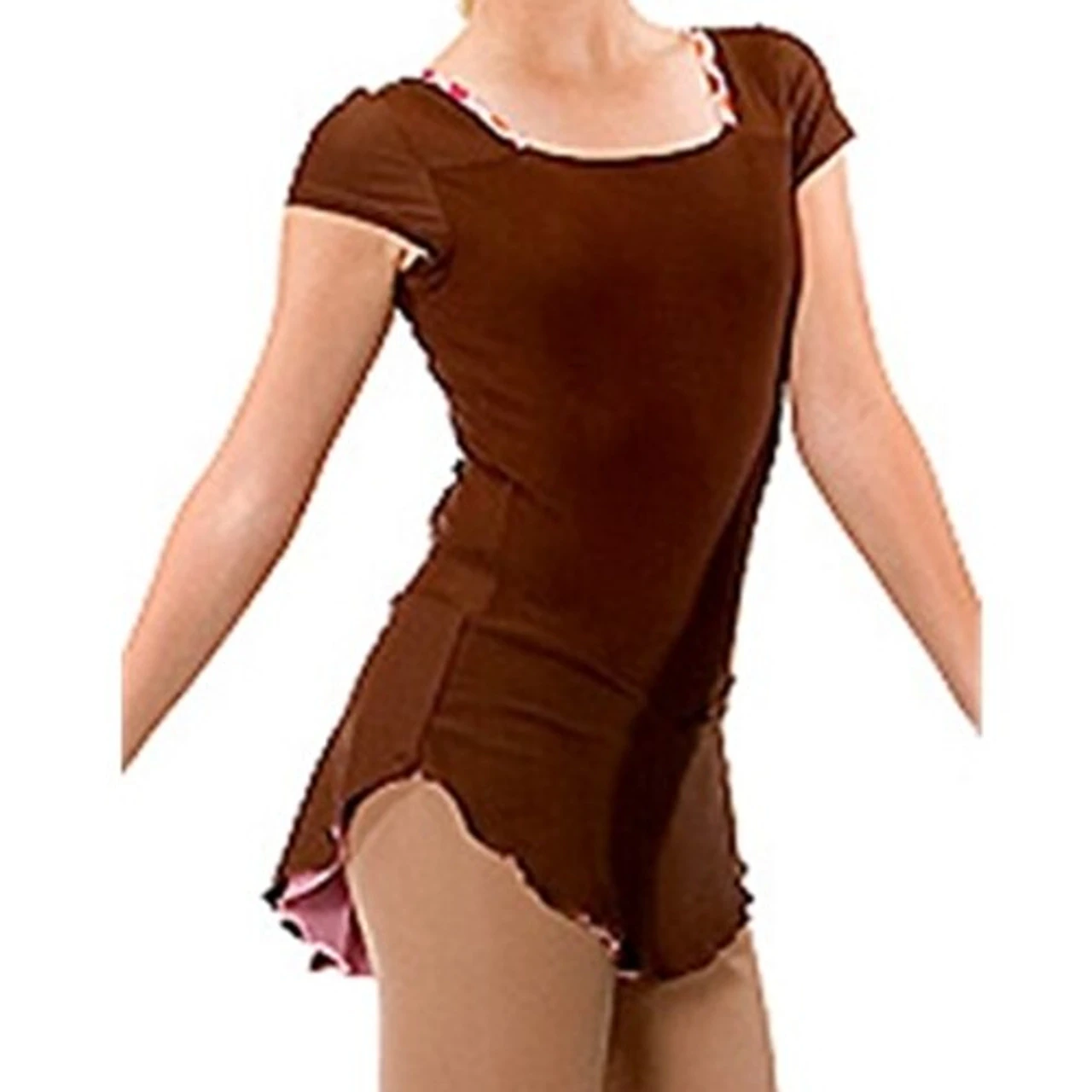 Darling “ladder-back” dress in warm tones is accented with our aubergine dot print. Square neckline with cap sleeves dips to low back with contrast dot print. Adorable on the ice! Italian matte tricot base with flat front skirt and contrast stretch illusion mesh underskirt. Too fun!