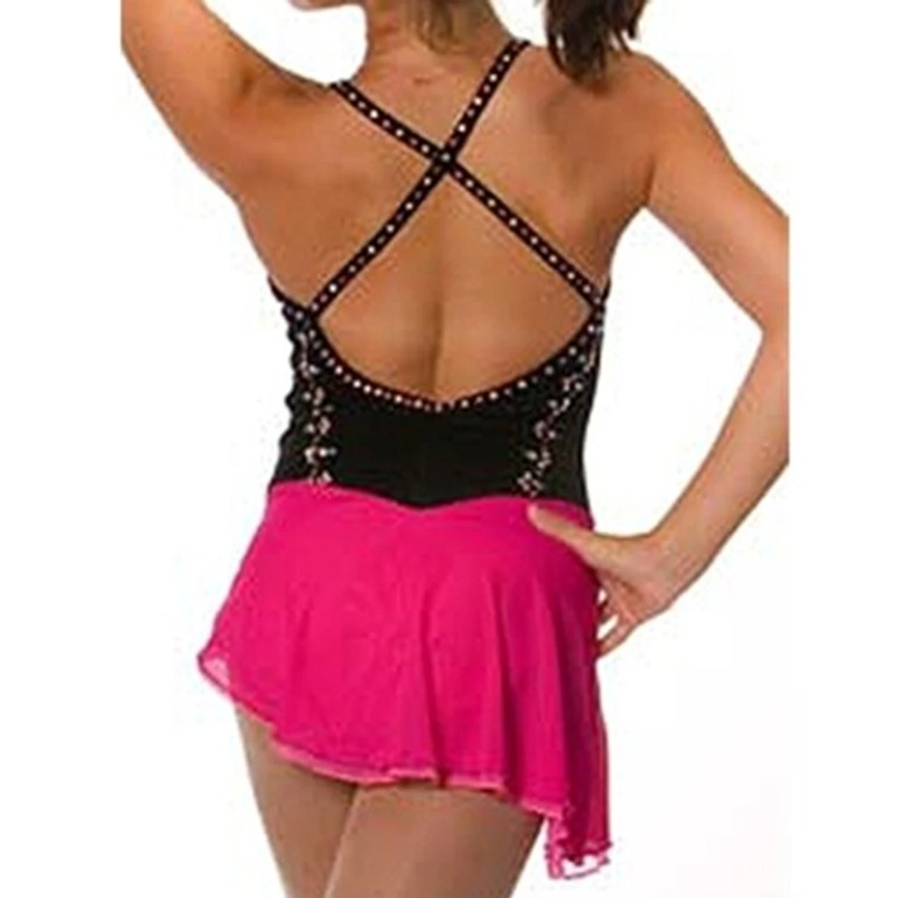 Updated lace & velvet corset dress perfect for your Spanish influenced freestyle program. (Bodice secured with nude mesh inserts.) Angled double mesh 2-color contrast skirt—for a “flip” of color. Strappy back.