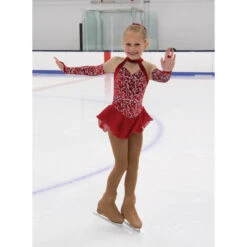 This ruby toned velvet dress is drizzled in silver glitter and styled with classic details including a sweetheart front neckline, a flowy georgette skirt edged in silver, a bow back with a crystal center and glove inspired sleeves with finger points.