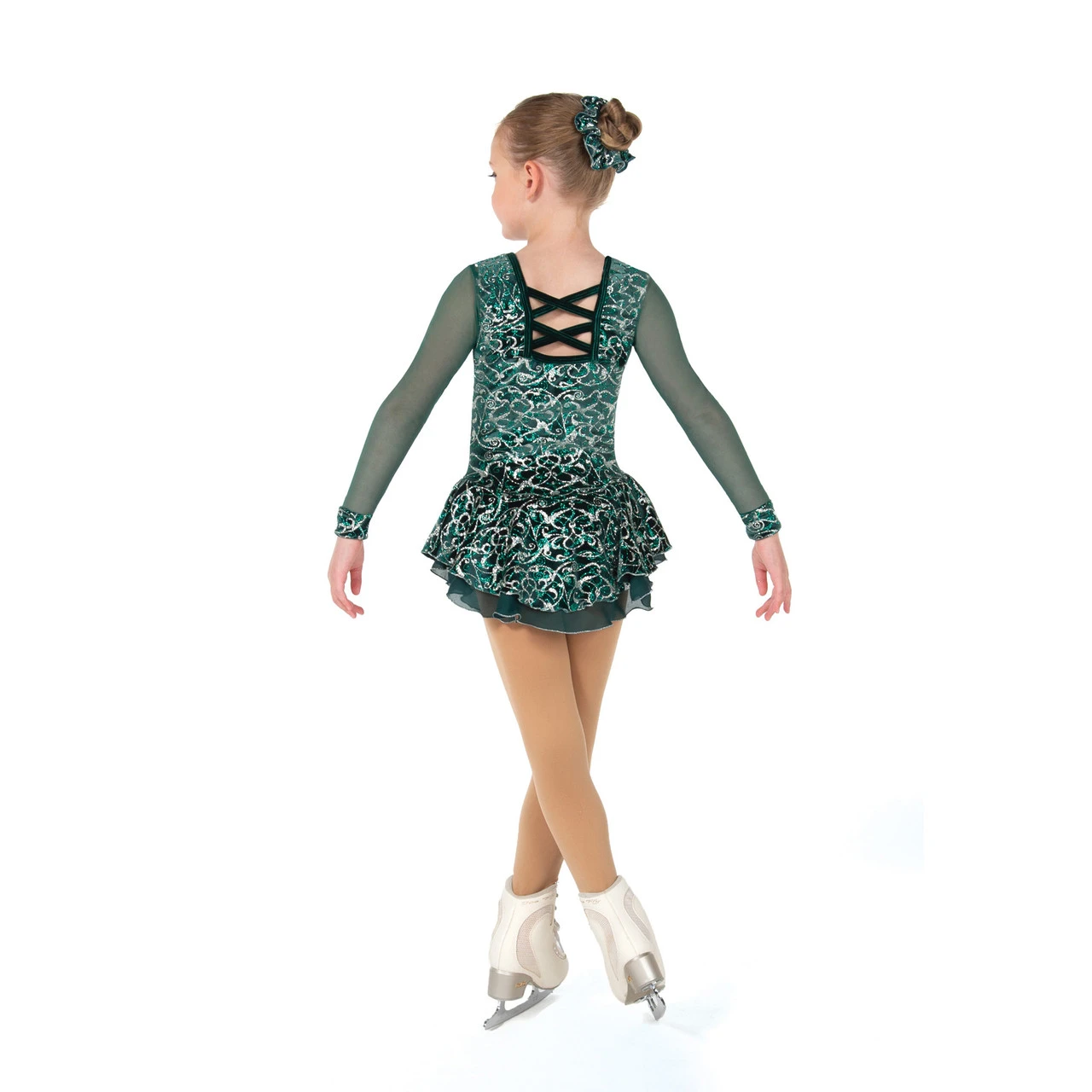 Deep clover green velvet dress with generous swirls of silver and emerald green glitter, long mesh sleeves cuffed in glitter, a square neckline front and back, and a double layer skirt of georgette under glitter velvet.