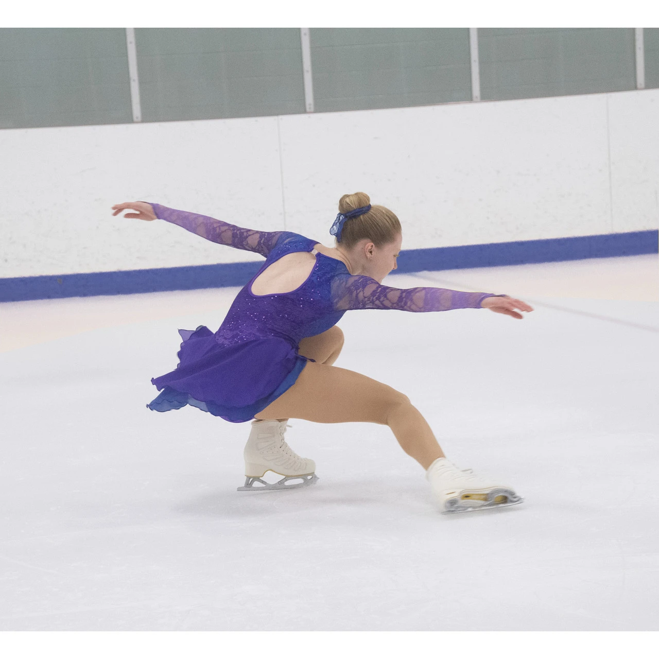 Shaded lace blends from flag blue at the shoulders to purple iris at the waist. Long lacy sleeves with finger points, a back keyhole and double layer georgette skirt of purple and blue are complemented by the sparkle of sequins that line the bodice.