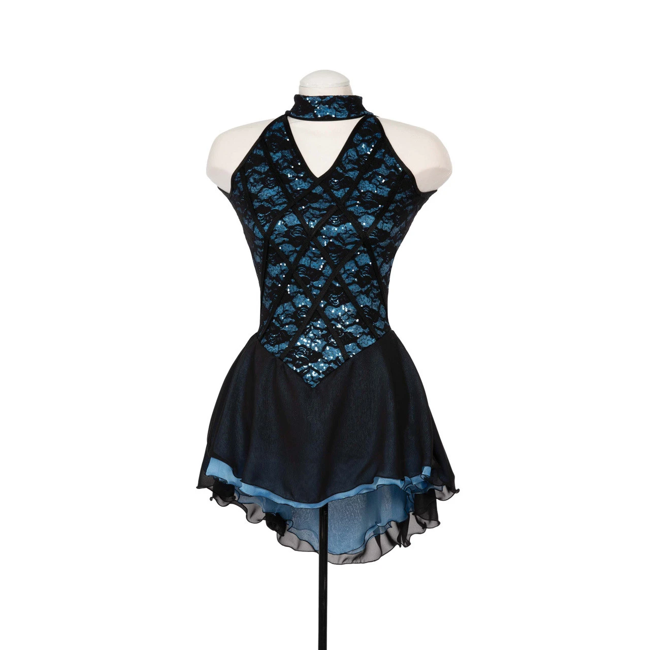 Glamorous sequin dress overlaid with black lace and a series of crossed spaghetti straps that also accent the open back keyhole. Choker style neck and back zipper, plus a layered skirt of black over contrasting chiffon. Lined.