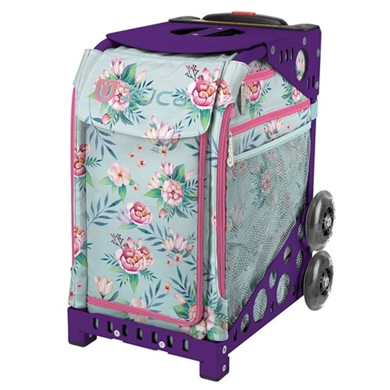 A true all-around athlete, the patented design of the ZÜCA Blooms Ice Skate Bag demands attention. Agile. Graceful. Absurdly versatile. And with a light, super-strong aluminum frame and oversized polyurethane wheels (they climb stairs), even school hallways and cracked sidewalks can’t slow its roll. Other sweet features? A removable hand washable bag. Wheels that flash. Tons of custom combos. And yes, a built-in seat. Ready for this ice skating suitcase? Game on.